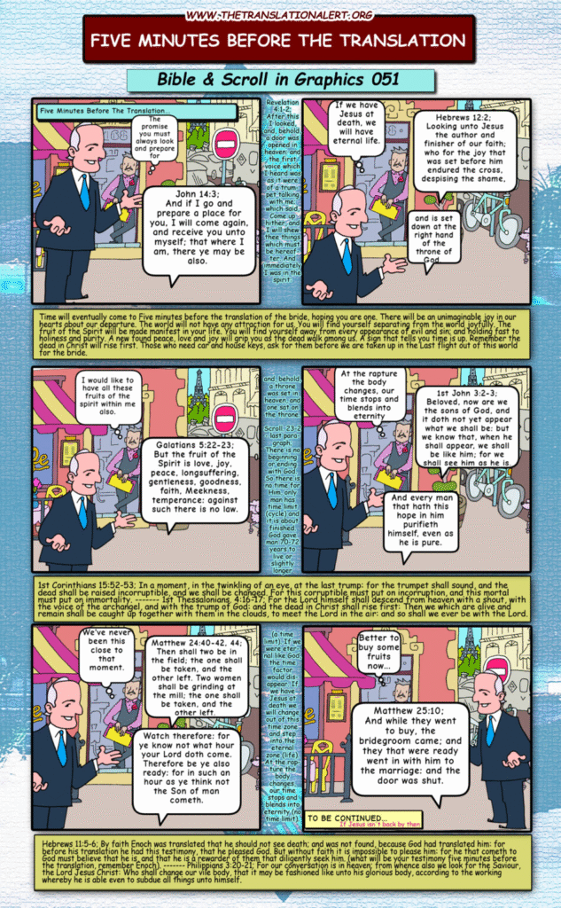 Time will eventually come to Five minutes before the translation of the bride, hoping you are one. There will be an unimaginable joy in our hearts about our departure. The world will not have any attraction for us. You will find yourself separating from the world joyfully. The fruit of the Spirit will be made manifest in your life. You will find yourself away from every appearance of evil and sin; and holding fast to holiness and purity. A new found peace, love and joy will grip you as the dead walk among us. A sign that tells you time is up. Remember the dead in Christ will rise first. Those who need car and house keys, ask for them before we are taken up in the Last flight out of this world for the bride.